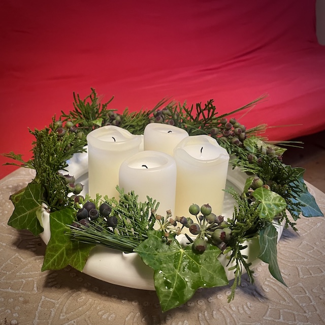 Noch mitten am Nachmittag, und es ist bereits düster draußen. Keine Helligkeit an diesen letzten Novembertagen. Mit dem näher rückenden Advent wächst in mir das Bedürfnis nach Grün und Rot, nach herzerwärmendem Kerzenlicht. Ich hole Efeu aus dem Garten. Thujengrün und Seidenföhre habe ich beim Wegführen der Äste vom Grünschnittplatz mitgenommen. Dann nur noch den Keramikring mit Wasser füllen, die Ästchen hineinstecken, vier Kerzen in die Mitte – und voilà: fertig ist mein Adventskranz.